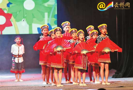 30日晚,昆明市盘龙区新迎三小30名四年级小学生,在昆明市抗战胜利纪念堂进行了一场别开生面的经典景颇族剧场《目瑙纵歌》的汇报演出,这是我省首部民族美育课程的汇报展示,昆明市内小学的近600名一线教育专家、文艺工作者及师生观看了表演。
