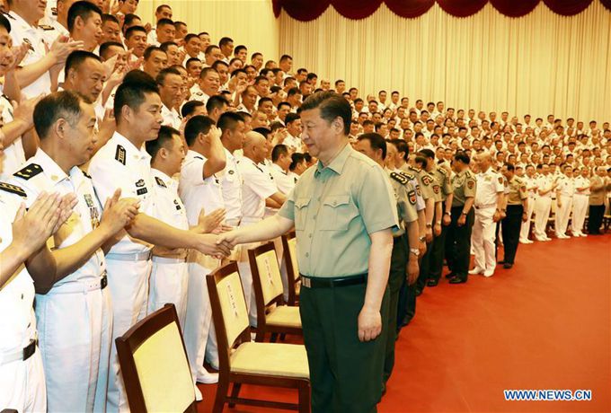 President Xi Jinping, who also is chairman of the Central Military Commission, greets officers of the People's Liberation Army Navy on Wednesday during his visit to naval headquarters in Beijing. ZHA CHUNMING / XINHUA