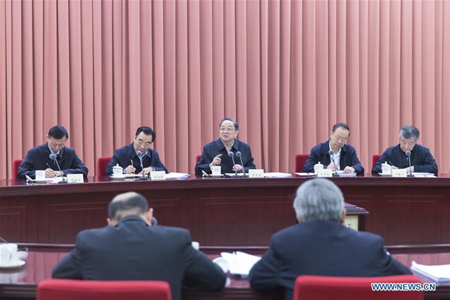 Yu Zhengsheng (C, rear), chairman of the National Committee of the Chinese People's Political Consultative Conference, presides over a bi-weekly consultation session on the revision of the country's Law on the Prevention and Control of Water Pollution in Beijing, capital of China, April 27, 2017. (Xinhua/Cui Xinyu)