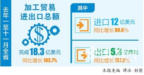 去年,在外贸整体增长乏力的背景下,云南省的加工贸易却带来一抹亮色:据海关统计,1至11月,全省加工贸易进出口总额完成18.3亿美元,同比增长103.7%。其中,进口12亿美元,同比增长89.6%;出口6.3亿美元,同比增长137.3%。