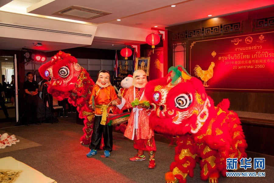 1月20日,泰国2017年春节文化活动新闻发布会现场的舞狮表演。(图片提供:泰国旅游局)