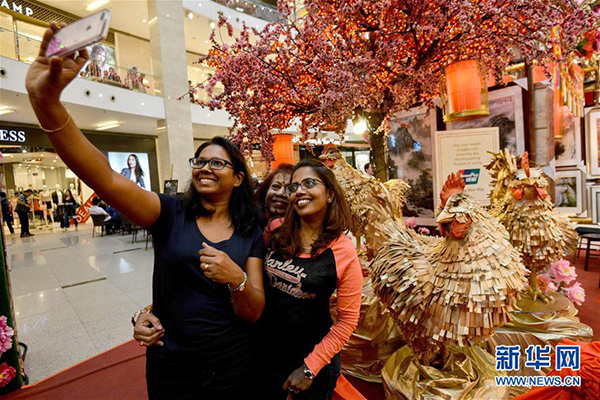 1月20日,在马来西亚吉隆坡,游客们与鸡年饰品合影。马来西亚首都各大商场布置鸡年饰品,迎接农历鸡年的来临。新华社发(张纹综摄)