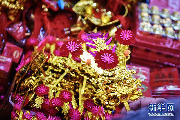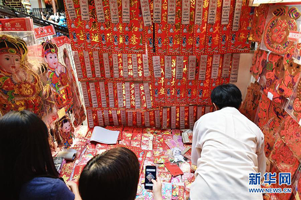 1月22日,在泰国曼谷唐人街,一名摊主悬挂待售的春节饰品。随着农历春节的临近,泰国曼谷唐人街节日气氛渐浓,许多市民前往购置年货,迎接新春佳节。新华社记者李芒茫摄