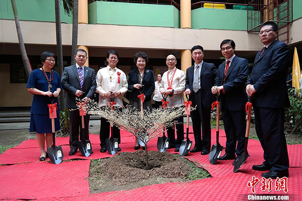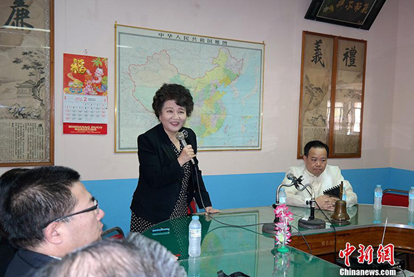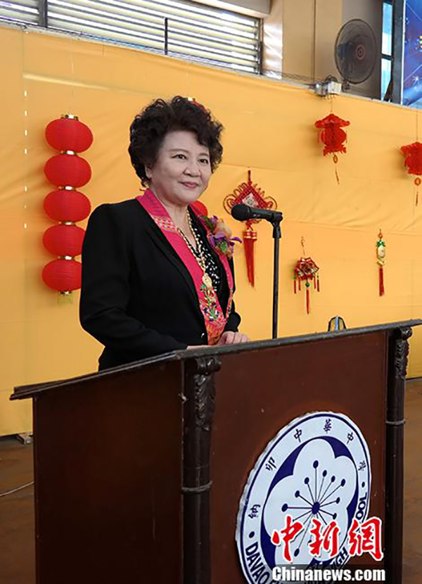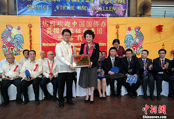 2月8日,中国国务院侨务办公室主任裘援平在菲律宾南部城市达沃访问,她先后走访当地侨社会所、华人消防队、华文学校,与当地华校华文教师座谈,并出席达沃侨界新春联欢会。图为裘援平主任向纳卯中华中学赠送中文图书,捐建“华星书屋”图书馆。 中新社记者 张明 摄