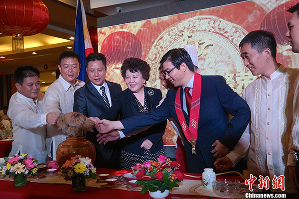 裘援平主任与中国驻宿务总领事施泳与当地侨领一道在侨界新春联欢会上为闽菜“佛跳墙”揭开坛盖。 中新社记者 张明 摄
