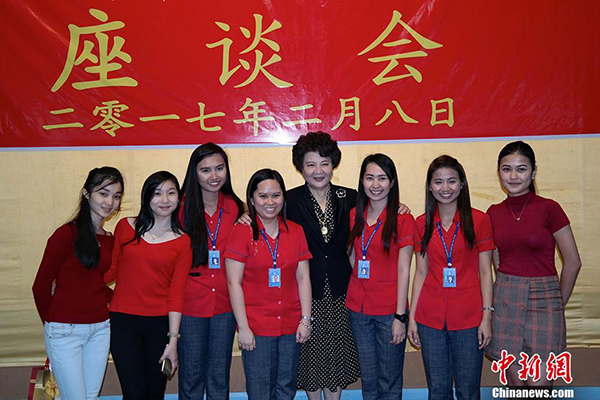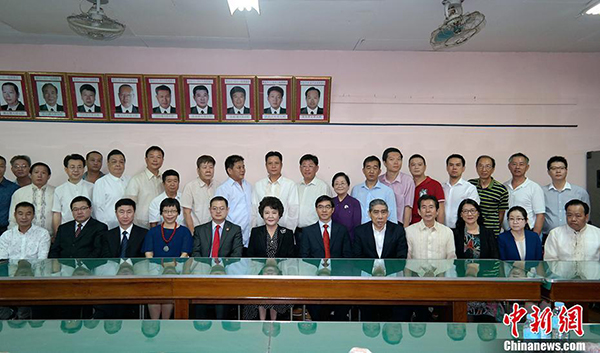 裘援平主任在纳卯中华中学访问后参加当地华校华文教师座谈会,与7名曾到中国培训的菲律宾华文教师合影。 中新社记者 张明 摄