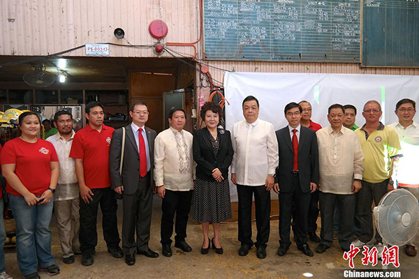 裘援平主任一行在访问达沃侨社会所时与当地侨领合影。 中新社记者 张明 摄