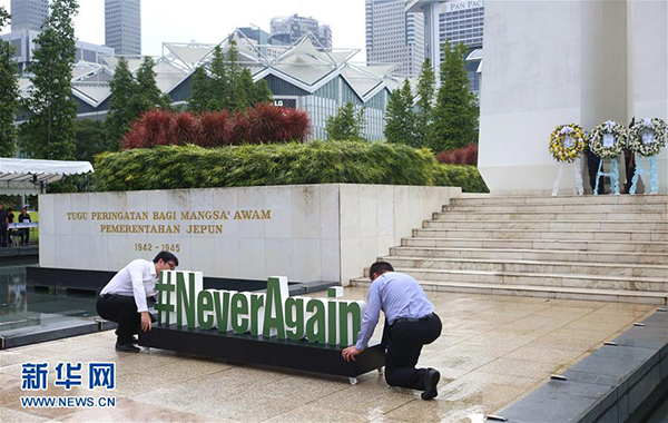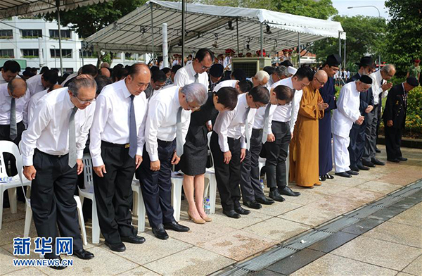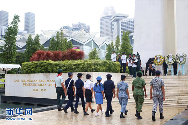 2月15日,在新加坡,参与悼念活动的各团体代表走向“日本占领时期死难人民纪念碑”。当日,新加坡中华总商会在新加坡市中心“日本占领时期死难人民纪念碑”前举行悼念活动,缅怀在日本占领时期被杀害的民众。新华社记者包雪琳摄