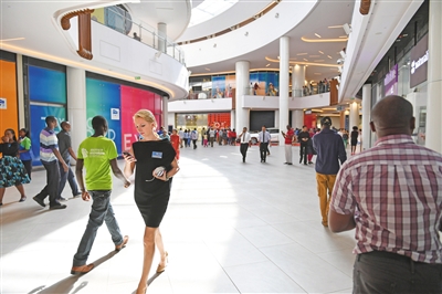 由中国企业承建的东非最大城市综合体——双河商城2月17日在肯尼亚首都内罗毕正式开业,肯尼亚总统肯雅塔出席了开业典礼。图为人们在双河商城漫步。