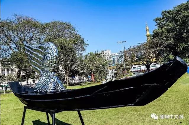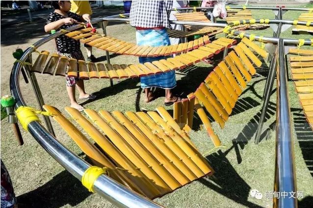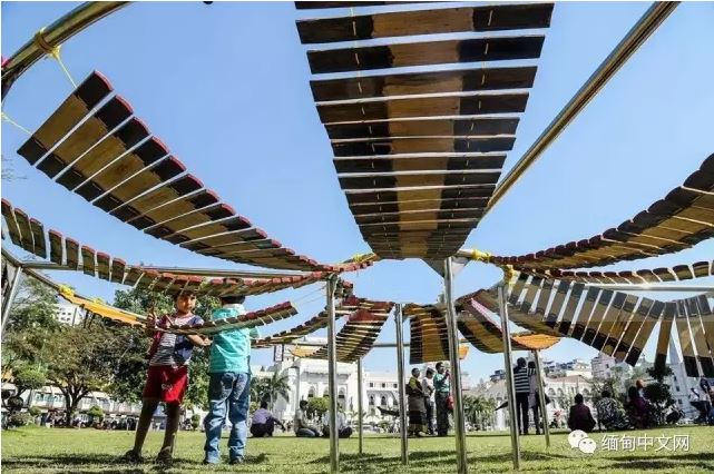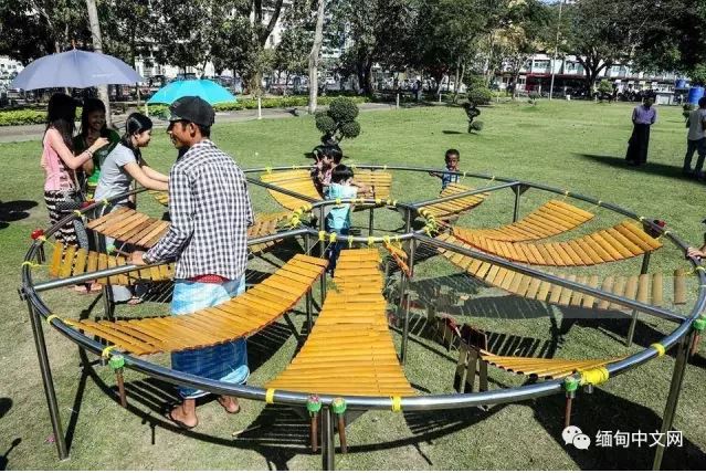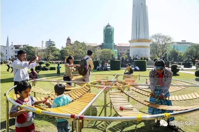 2月26日仰光市摩诃般杜拉公园,展出一些特殊的作品,有用缅甸特产象竹制作的竹琴,不过这可不是大家常见的竹琴,而是加大号的,可以供多人同时使用。