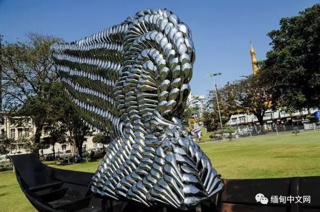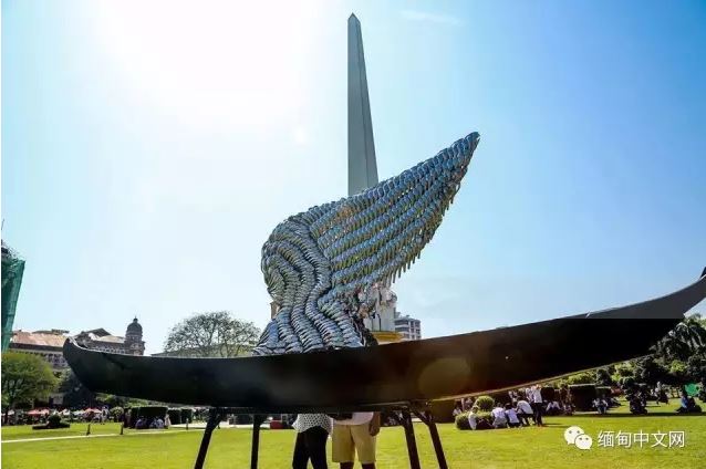 还有“光之翼”,使用了众多的不锈钢勺子,虽然取材十分普通,但是通过艺术家的加工,在环境的映衬之下,升华其内在。特别是配上船作为底座,整个造型十分威武。