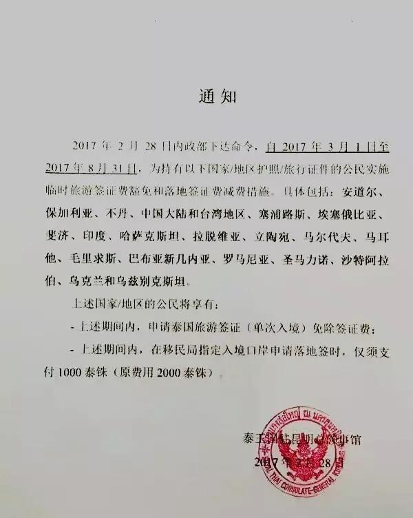 泰国内政部下达命令,自2017年3月1日至2017年8月31日,为持有以下国家/地区护照/旅游证件的公民实施临时旅游签证费豁免和落地签证费减费措施。