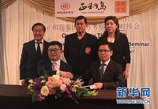 华立集团东盟区域总部总裁刘文欣(前排右一)与正和岛国际业务部总经理姜胜(前排左一)共同签署合作协议。新华网发 尤东婕 摄