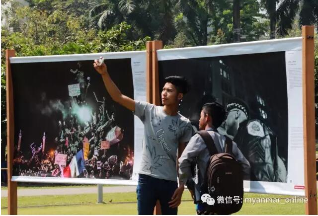 两位缅甸青年7日在仰光马哈班杜拉公园内举行的世界新闻摄影展展出的作品前自拍留念。