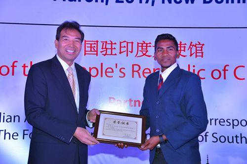 罗照辉为德里大学“中国行社交媒体大赛”获奖学生颁发奖品和证书 (来源:中国驻印度使馆网站)