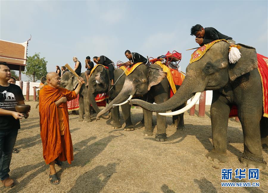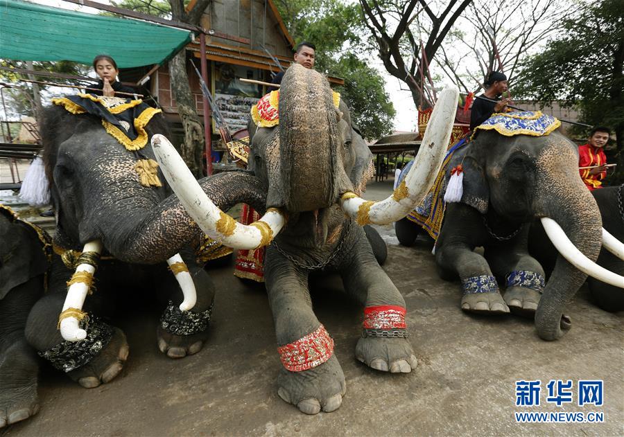 3月13日,在泰国大城,几头大象参加大象日祝福活动。当日,泰国大城举办多种活动庆祝一年一度的大象日。
