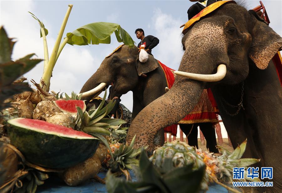 3月13日,在泰国大城,几头大象在大象日祝福活动上吃水果。当日,泰国大城举办多种活动庆祝一年一度的大象日。