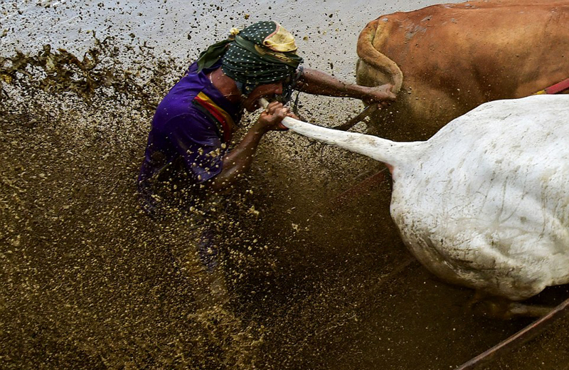在奔牛赛中,参赛者要拉紧两只牛的尾巴,在泥地中快速奔跑。