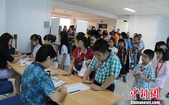 由印尼文化与教育部华文教育综合统筹处和雅加达华文教育协调机构联合举办的2017年度第一次汉语考试,日前在印尼全国15个分考点顺利进行。图为考生签到入场。中新社记者 陈宁洁 摄