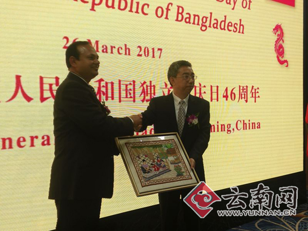 云南网云桥网讯(记者 王世学)3月26日,孟加拉人民共和国独立和国庆46周年招待会在昆明举行。孟加拉国驻昆总领事道德·阿里致辞,云南省人民政府副省长陈舜、其他国家驻昆总领事、云南工商界代表等100多人出席招待会。