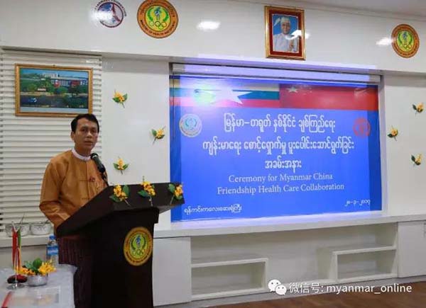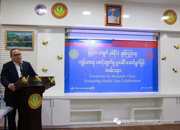 仰光省省长吴漂敏登3月28日在仰光仰京儿童医院举行的中华慈善总会“一带一路 胞波情 先心病儿童救助行动走进缅甸“启动仪式上致辞