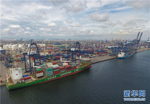 4月8日,一艘中国海运企业的货轮(左)停泊在印度尼西亚雅加达丹戎不碌港码头。位于雅加达最北端的丹戎不碌港是印尼最大的港口,目前已开通至中国天津、上海、深圳、香港等多个港口的航线,从这里出发,货轮最快只需6天即可抵达中国。随着中印尼两国经贸往来不断深入,雅加达丹戎不碌港已成为“21世纪海上丝绸之路”上的主要通道之一。新华社记者 杜宇 摄