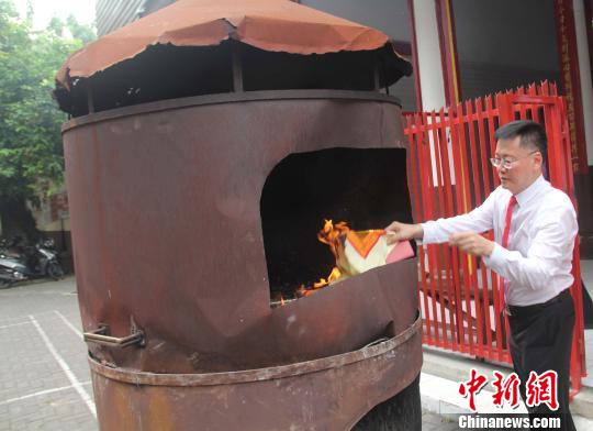 点香烧金纸,印尼华人的祭祀程式与中国完全一样。 中新社记者 林永传 摄
