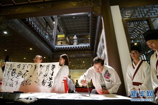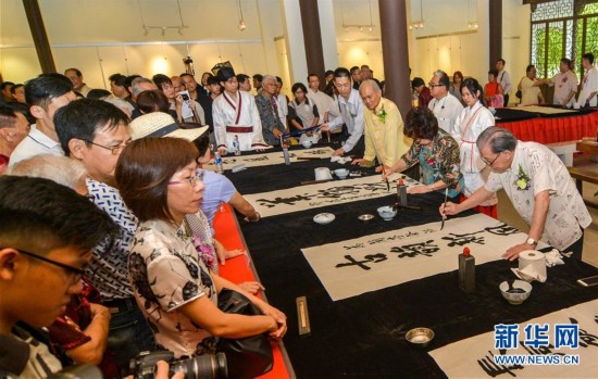 4月16日,在马来西亚士毛月,嘉宾参加书法交流活动。当日,马来西亚书艺协会在雪兰莪州中华人文碑林举办了马来西亚“兰亭祭”祭典活动,在纪念中国书圣王羲之的同时,也邀请国内外书艺名家进行书艺交流。新华社记者 张纹综 摄