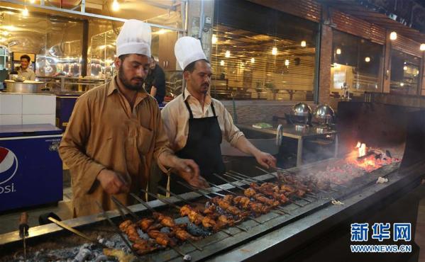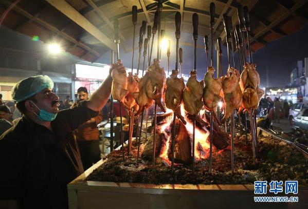4月2日,在巴基斯坦拉瓦尔品第的一条美食街上,厨师在烤制鸡肉串和羊肉串。巴基斯坦菜肴大多采用炖、炸、烤等烹饪方法,味道香辣,肉类以牛羊肉和鸡肉为主,常见蔬菜则有洋葱、青椒、西红柿、白菜、茄子、生菜、菠菜、豆类等。新华社记者 艾哈迈德·卡迈勒 摄