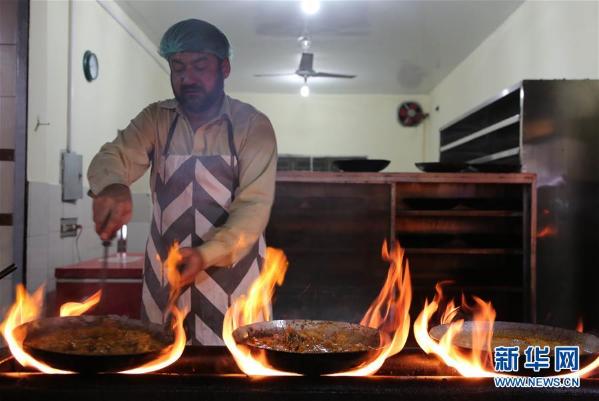 4月2日,在巴基斯坦拉瓦尔品第的一条美食街上,厨师在烹饪“铁锅羊肉”。“铁锅羊肉”通常与馕一起食用,是巴基斯坦人餐桌上常见的一道菜。巴基斯坦菜肴大多采用炖、炸、烤等烹饪方法,味道香辣,肉类以牛羊肉和鸡肉为主,常见蔬菜则有洋葱、青椒、西红柿、白菜、茄子、生菜、菠菜、豆类等。新华社记者 艾哈迈德·卡迈勒 摄