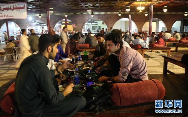 4月2日,在巴基斯坦拉瓦尔品第的一条美食街上,人们在享用美食。巴基斯坦菜肴大多采用炖、炸、烤等烹饪方法,味道香辣,肉类以牛羊肉和鸡肉为主,常见蔬菜则有洋葱、青椒、西红柿、白菜、茄子、生菜、菠菜、豆类等。新华社记者 艾哈迈德·卡迈勒 摄