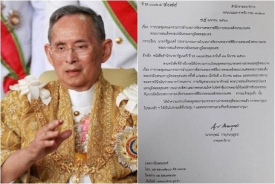 皇家秘书处的文件(右)指出已故泰国拉玛九世普密蓬国王的火葬相关仪式将在今年的10月举行。