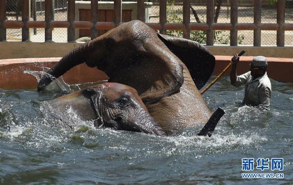 4月19日,在巴基斯坦卡拉奇动物园,一名工作人员为大象洗澡。 巴基斯坦受高温侵袭,许多地区气温超过45摄氏度。新华社/法新
