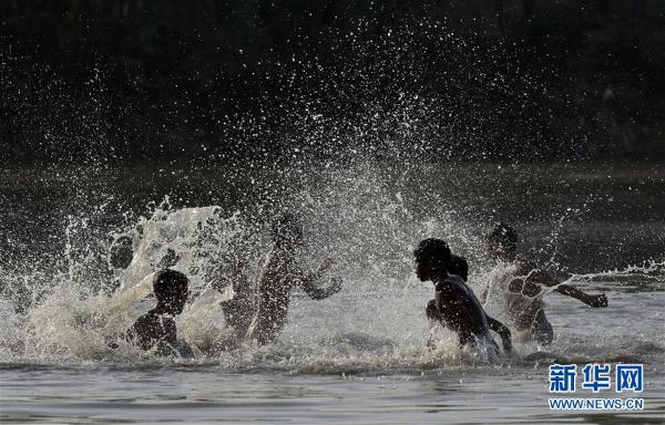 4月19日,在巴基斯坦拉合尔,少年在河中戏水降温。巴基斯坦受高温侵袭,许多地区气温超过45摄氏度。新华社/法新
