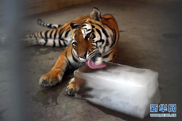 4月19日,在巴基斯坦卡拉奇动物园,一只老虎舔冰块降温。巴基斯坦受高温侵袭,许多地区气温超过45摄氏度。新华社/法新