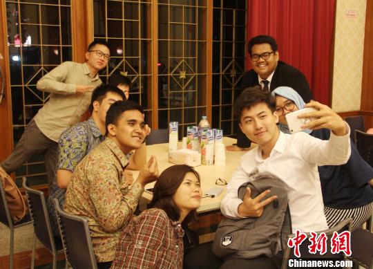 两国青年学生一起玩自拍。中新社记者 林永传 摄