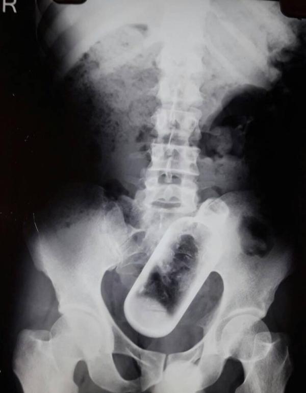 图为该男子的X光胶片,在胯骨上方可以清晰地看到一个瓶子。