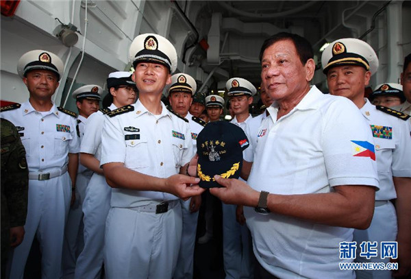 5月1日,在菲律宾达沃市,长春舰舰长胡杰(前左)向菲律宾总统杜特尔特(前右)赠送舰帽。新华社发(禹威摄)