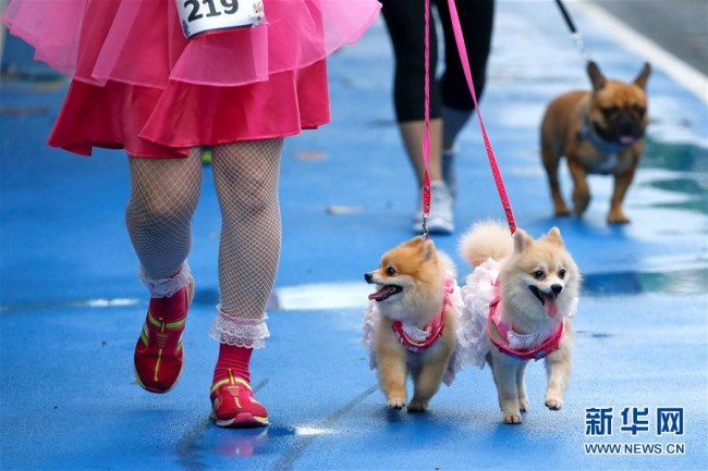 5月7日,在泰国首都曼谷,狗的主人们与爱犬一起跑“宠物狗迷你马拉松”。 新华社/路透