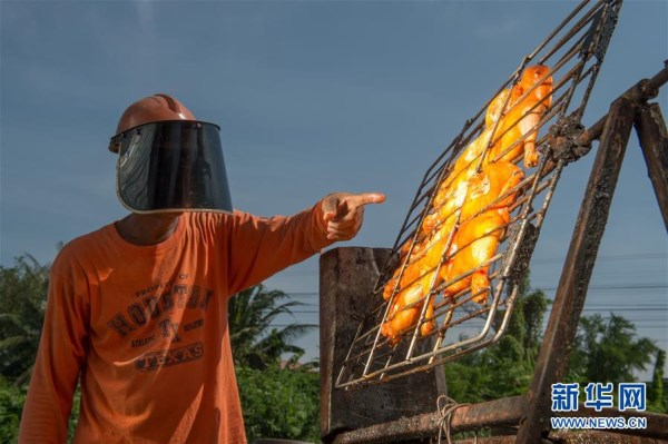 5月4日,在泰国碧武里府,小商贩西拉·素他拉用太阳能装置制作烤鸡。西拉·素他拉用一个巨大的镜面板反射太阳光,反射光产生的高温很快把夹在铁架中的鸡肉烤熟。 新华社/法新