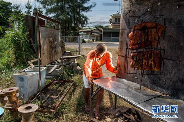 5月4日,在泰国碧武里府,小商贩西拉·素他拉用太阳能装置制作烤鸡。西拉·素他拉用一个巨大的镜面板反射太阳光,反射光产生的高温很快把夹在铁架中的鸡肉烤熟。 新华社/法新