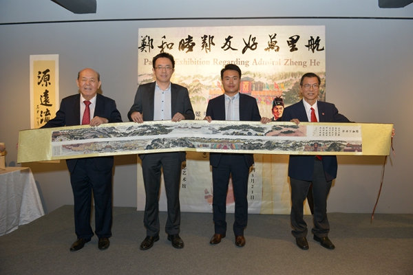 马来西亚华人博物馆馆长吴德芳(左一)、中国驻马来西亚大使馆文化主任张鑫杰(左二)等嘉宾展示王新循创作的《郑和下西洋》艺术品。张纹综 摄