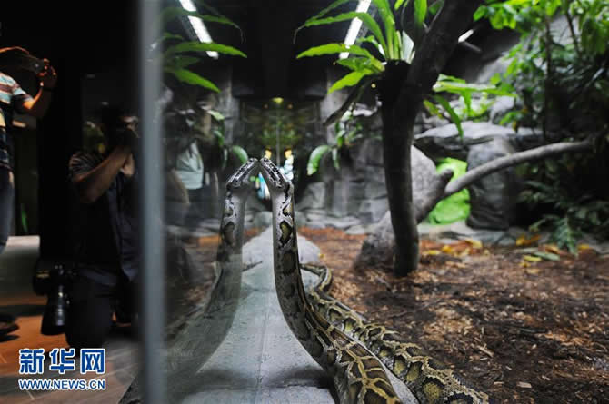 这是5月24日在新加坡动物园的爬行动物展区拍摄的一只网纹蟒。 新加坡动物园的爬行动物展区整修后将从5月27日起重新对公众开放。新华社发(邓智炜摄)