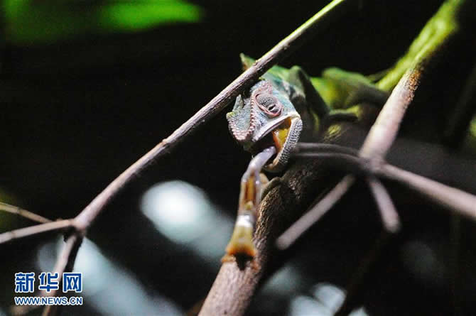 5月24日,一只豹纹变色龙在新加坡动物园的爬行动物展区进食。 新加坡动物园的爬行动物展区整修后将从5月27日起重新对公众开放。新华社发(邓智炜摄)