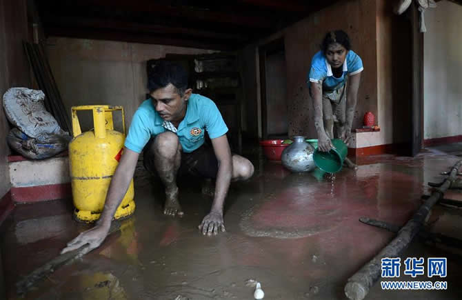5月30日,在斯里兰卡卡卢特勒,当地居民在家中清除积水。斯里兰卡灾难管理中心30日发布声明说,暴雨引发的洪水和山体滑坡已造成193人死亡、94人失踪,数十万家庭受灾。 新华社/法新