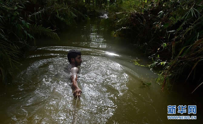 5月30日,在斯里兰卡卡卢特勒,一名男子在洪水中涉水前行。斯里兰卡灾难管理中心30日发布声明说,暴雨引发的洪水和山体滑坡已造成193人死亡、94人失踪,数十万家庭受灾。 新华社/法新