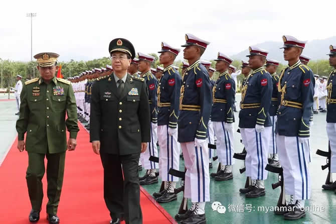 (缅甸国防军总司令敏昂莱与中央军委委员、军委联合参谋部参谋长房峰辉共同检阅缅甸三军仪仗队)