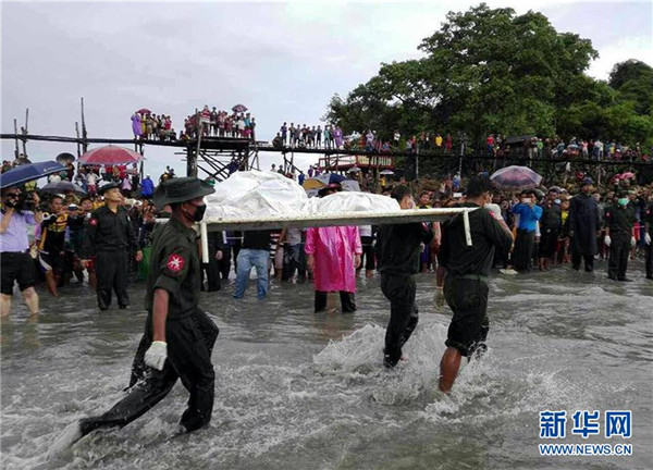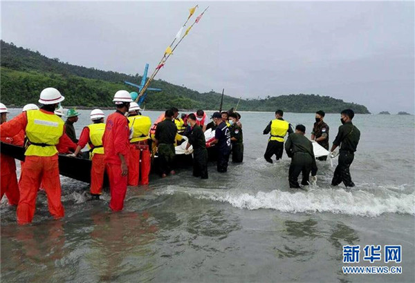 6月8日,在缅甸南部的德林达依省浪弄市附近,搜救人员准备转移遇难者遗体。缅甸国防军司令部8日宣布,搜救人员当天早上在缅南部的德林达依省浪弄市西南海域发现7日失联的军用运输机部分残骸和部分遇难者遗体。这架运输机于当地时间7日从德林达依省海滨城市丹老起飞,原计划飞往仰光。飞机在该省首府土瓦西南69公里处最后一次与土瓦机场联络,随后失联。机上共载有122人,包括14名机组成员和108名乘客。新华社发