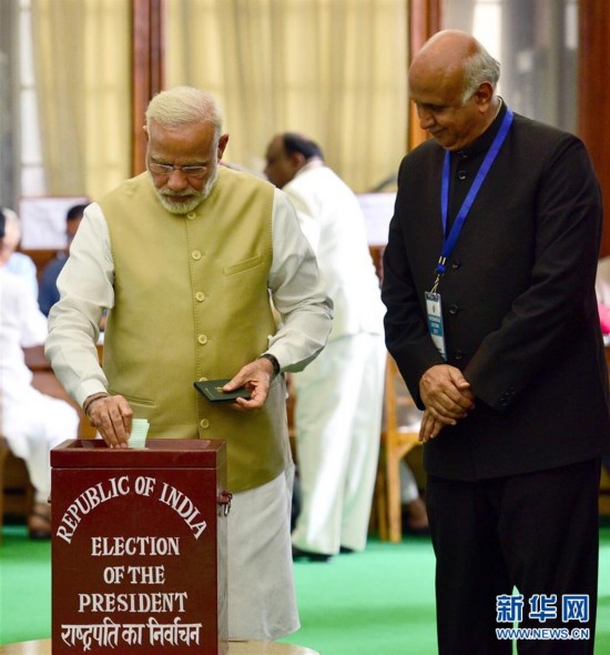 7月17日,在印度首都新德里,印度总理莫迪(左)在议会投票。 2017年印度总统选举17日正式开始投票,由印度联邦议会议员和各邦议会成员组成的选举团将选出新任印度总统,结果将于7月20日公布。新华社发(印度新闻信息局供图)