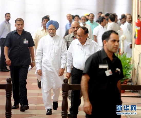 7月17日,在印度首都新德里,印度前总理曼莫汉·辛格(中左)在议会完成投票后走出会场。 2017年印度总统选举17日正式开始投票,由印度联邦议会议员和各邦议会成员组成的选举团将选出新任印度总统,结果将于7月20日公布。新华社发